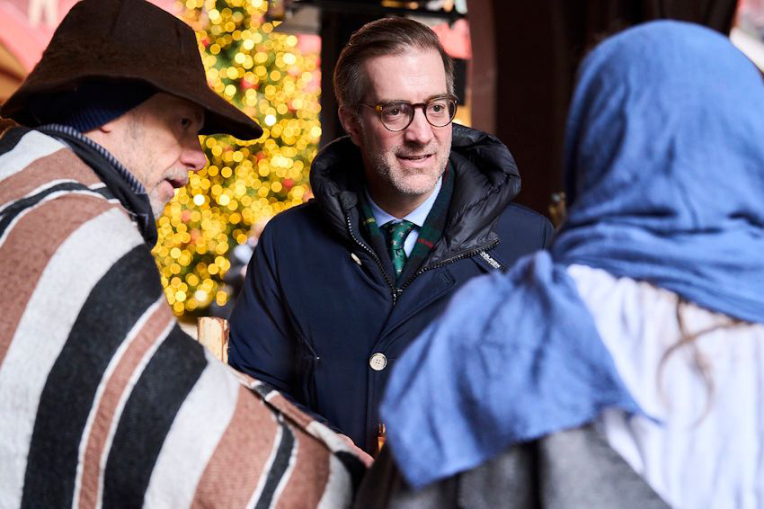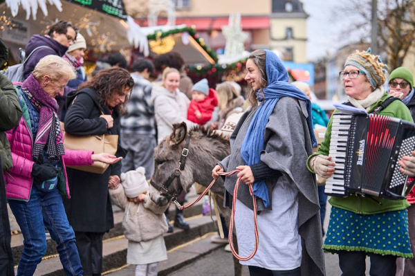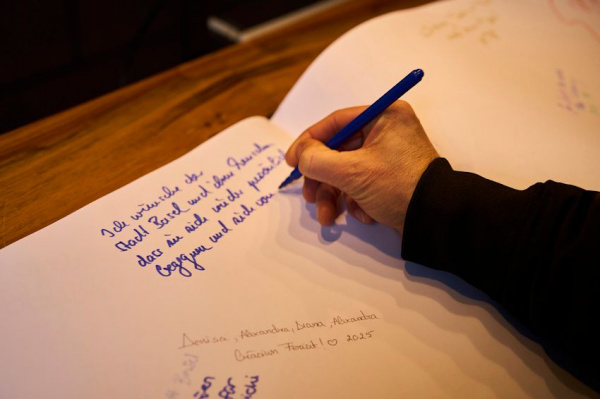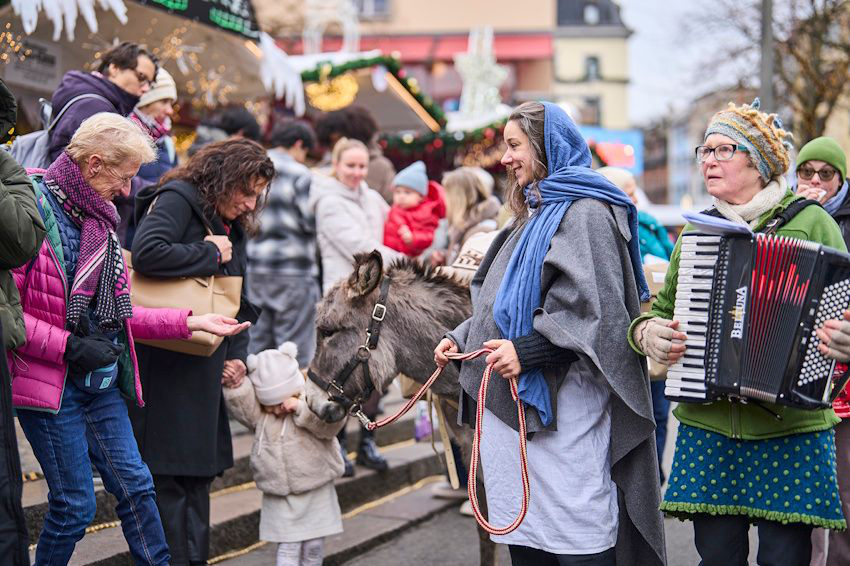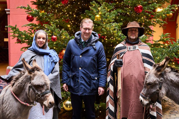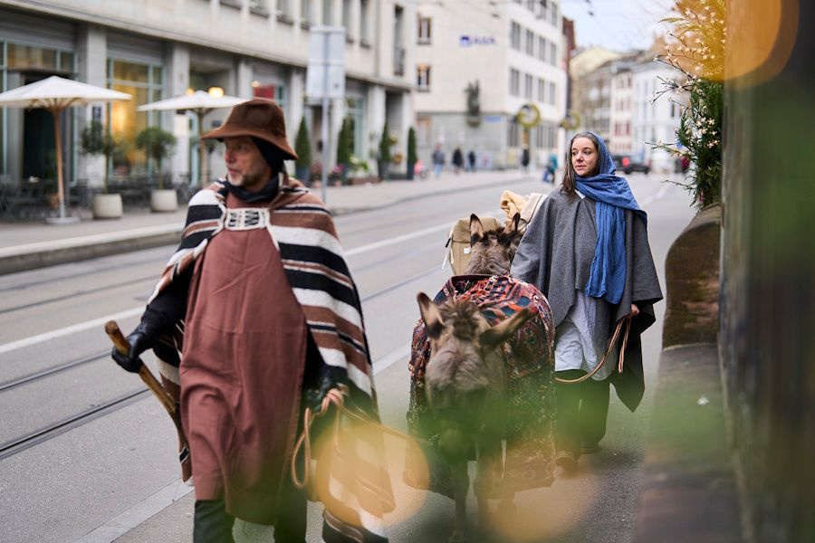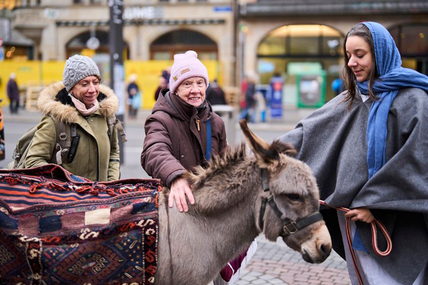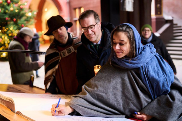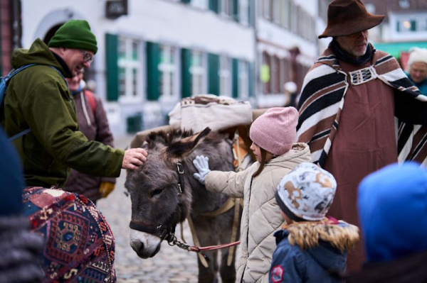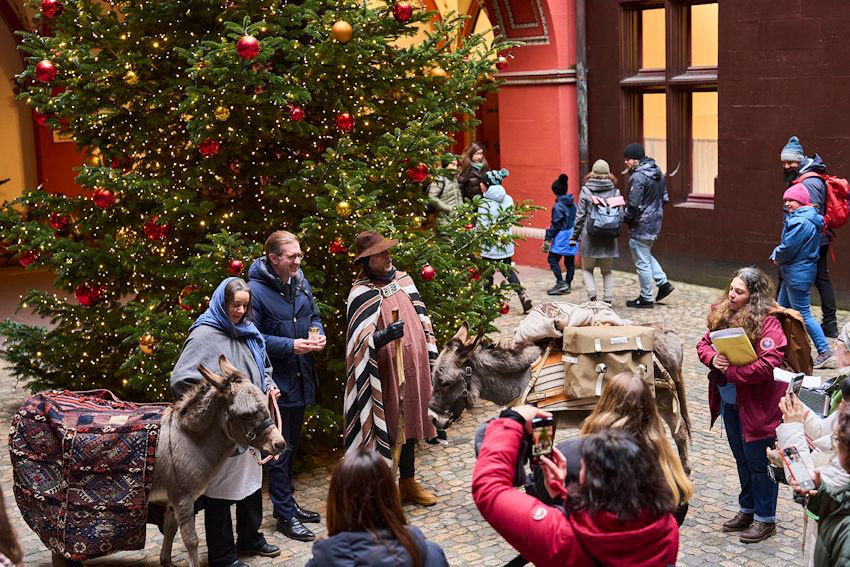 2025 waren Maria und Josef auf den bekannten Routen unterwegs. Am Dienstag, 16. Dezember 2025, besuchten sie allerdings zum ersten Mal den Rathausinnenhof, wo sie von Regierungspräsident Conradin Cramer begrüsst wurden. Maria und Josef überreichten ihm das Friedenslicht und trugen sich ins Wunschbuch der Stadt Basel ein. Dies und andere Impressionen finden Sie hier. Hier gibt es einen Tagebucheintrag von Sonja Lofaro, Bildung und Spiritualität.