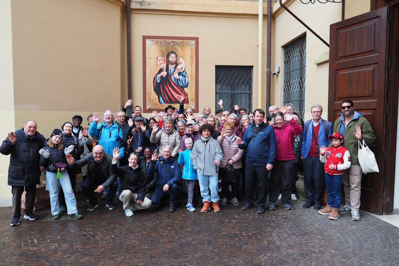 Der letzte Tag mit Programm bricht an. Einige stehen den dritten Tag in Reihe früh auf und feiern mit Kardinal Kurt Koch die Messe. Spätestens um 9 Uhr treffen sich jedoch nahezu alle vor der Casa Bonus Pastor. Gelegenheit für ein Gruppenfoto.