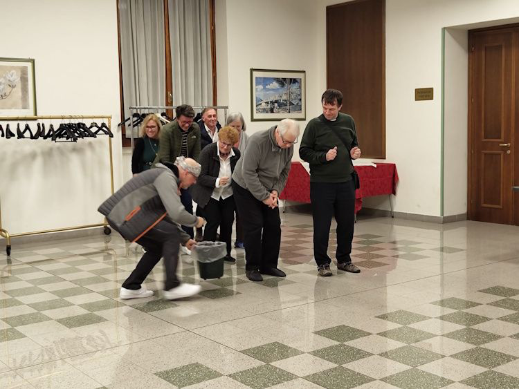 Per Bus, per Bahn und im Flugi – so unterschiedlich die Verkehrsmittel der insgesamt 54 Teilnehmenden an der Pastoralraumreise, so unterschiedlich die Uhrzeiten, zu denen sie am Sonntag ankommen. Beim Frühstück am Montag sind dann alle da. Viola Stalder (Jugendarbeit Heiliggeist) ist als Begleitperson vor allem auch für die jüngeren Teilnehmenden da. 8 Kinder und Jugendliche sind mit von der Partie. Auch sonst ist es eine gut gemischte Truppe: Der Jüngste ist sieben, die älteste mitgereiste Person 86. Sie kommen aus allen Pfarreien, aus den Sprachgemeinschaften, gar aus anderen Kantonen (BL, ZH). Ein Spiel nach dem Frühstück lockert die Atmosphäre und regt zum Kennenlernen an, dann geht es los.