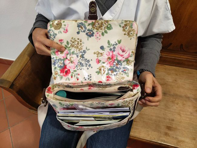 Das USB ist wirklich riesig. Am Anfang sagte ich spasshaft, man dürfe nichts im Büro vergessen und Du hast Deine Tasche erwähnt, die Du immer dabeihast. Was ist da drin, verrätst Du das? Im USB sind 16'000 Schritte pro Tag wirklich kein Problem und man kann viele Treppen steigen. Die Tasche bildet die Selbstsorge ab: Darin sind Wasser, Bonbons, Hygieneartikel. Aber auch die Seelsorge ist in der Tasche: Aus dem Bistum Würzburg ein dünnes Büchlein für die Feier des Sterbesegens, daraus brauche ich vor allem den Psalm 23. Gebete spreche ich frei und versuche sie kurz zu halten, möglichst mit etwas persönlichem aus dem Gespräch. Aber Psalm 23 ist zum Vorlesen. Dann sind natürlich die Segensbänder in der Tasche, ein Kalimba für Musik, meist für einen Moment von Abschied. Ich habe Bild- und Visitenkarten zum Abgeben und natürlich einen Stift.